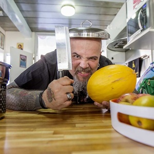 Acho que essa foto, na capa do disco, foi mexida. Eu estou um pouco maior e não estava tão distante da mesa. Mas continuo gostando de comida japonesa. Comi ontem, aliás. Nesse estúdio, tinha um delivery de "japa" e comíamos todo dia. A comida empilhada era o almoço. A ideia da arte desse projeto foi fotografar a gente gravando. Não tem muita produção.