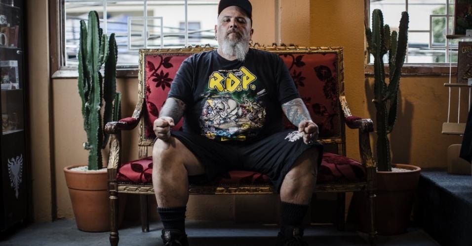 Lucas Lima/UOL Como punk clássico que é, João Gordo se diz adepto da anarquia. Mas algo está fazendo brotar outro posicionamento político, mais à esquerda: a nova "escalada conservadora" brasileira. "Nunca votei no Lula, mas agora vou votar. Porque, do jeito que a coisa está indo, em 2039 a suástica vai ser moda, cara. Vai ter pijaminha de suástica. Óculos de suástica. A bandeira do Brasil vai ter uma suástica vermelhona. Depois que fizeram um monte de bosta, o brasileiro está complemente tomado, manipulado por isso aqui [aponta para o celular]. Está tudo polarizado. Os idiotas se juntaram", entende.