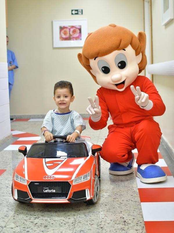 "Eu que vou ganhar!", disse Bernardo assim que saiu do quarto em que está internado e viu o Senninha ao lado do carrinho, nesta manhã. Liberado por seu médico para interagir com o personagem, que é fã, ele logo pulou dentro do veículo e partiu pelos corredores do Hospital. O pai, Jorge de Oliveira, conta que Bernardo se sente acolhido quando precisa de tratamento ou internação e já conhece as enfermeiras e médicos pelo nome. "Escolhemos um plano de saúde que cobrisse o Leforte, pois desde que o Bernardo apresentou dificuldades respiratórias, um time de especialistas o acompanha e indica o melhor tratamento. O cuidado próximo e carinhoso dos profissionais faz total diferença ao enfrentar as internações que ele teve e ainda tem".