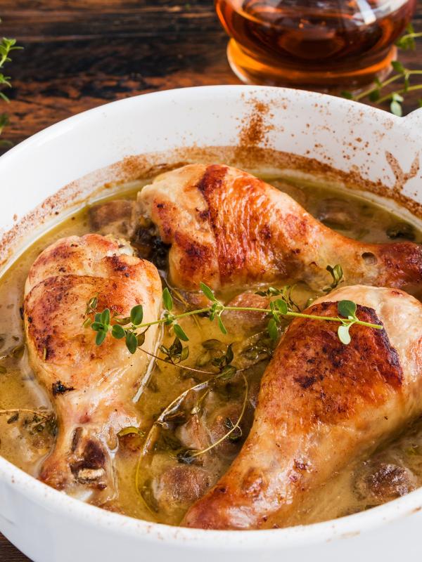 Se fizer marinada para pegar mais o tempero, acrescente alguma bebida alcoólica, como vinho branco ou cerveja, e adicione a marinada toda na hora de levar ao forno. Fique de olho na temperatura e no tempo, para que o frango não resseque. Nesse tipo de preparo, manter a pele contribui para deixar a carne mais macia e a pele crocante e dourada fica irresistível.